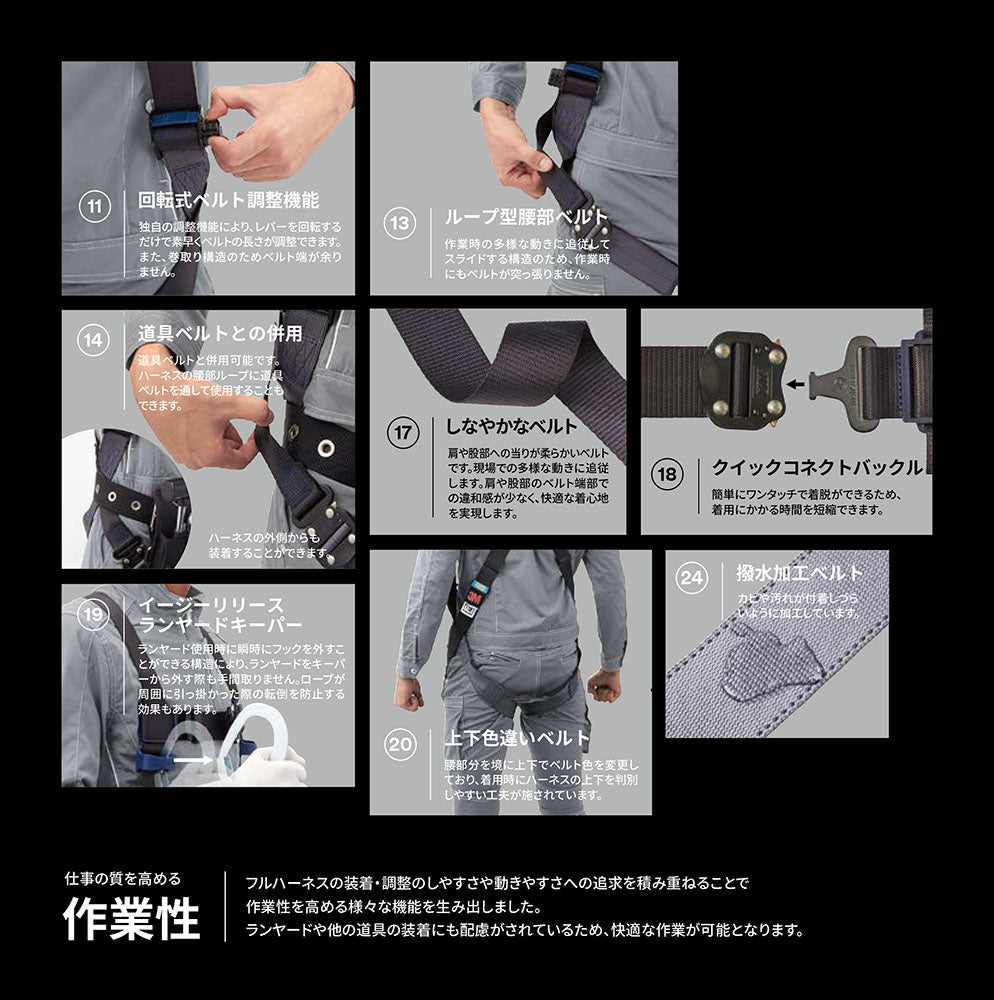 ●墜落防止時に骨盤全体に荷重が分散する、快適かつ安全な設計です。