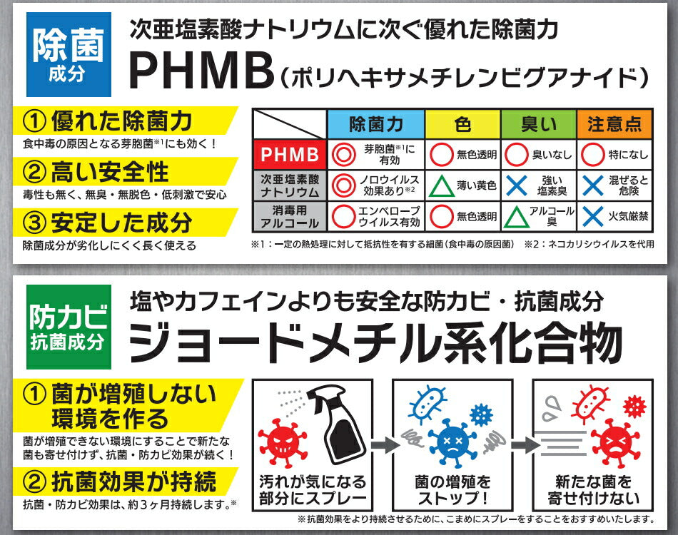 ■塩やカフェインよりも安全な防カビ・抗菌成分「ジョードメチル系化合物」使用!これにより菌が増殖しない環境を作り、約3か月抗菌効果を持続します。