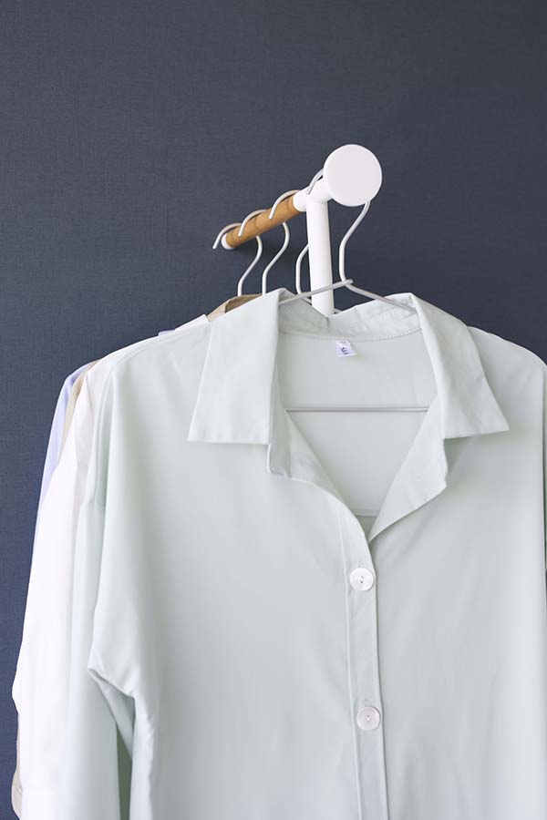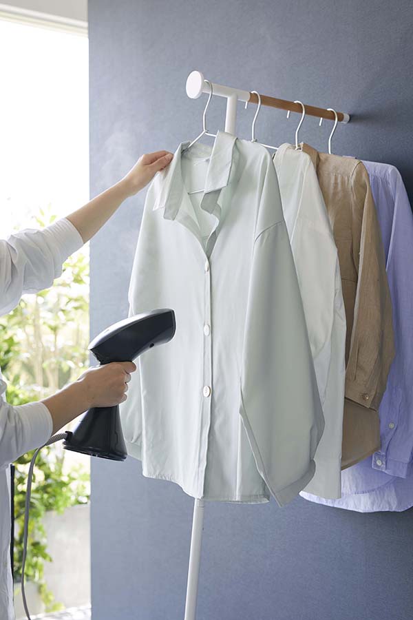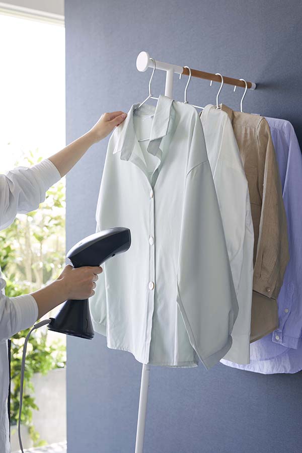 ●ハンガーに掛けたまま衣類スチーマーをあてられる立て掛け式アイロン掛けハンガー。