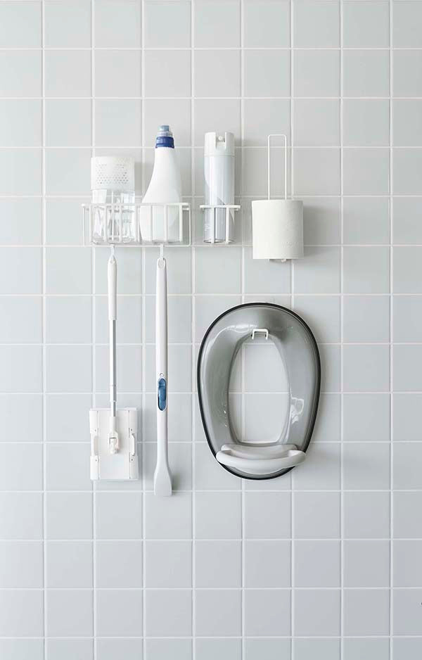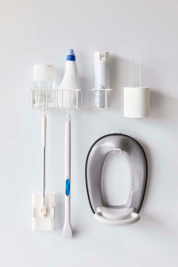 ●フィルムフックでトイレタンクやタイル、手洗台に浮かせて設置できるトイレ用品収納シリーズ。