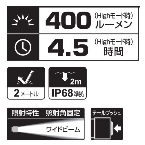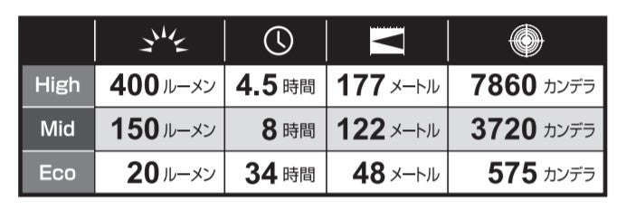 ●明るさ(約): 400ルーメン(Highモード時)/ 150ルーメン(Midモード時)/ 20ルーメン(Ecoモード時)