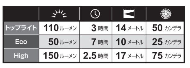 ●明るさ(約): 110ルーメン(トップライト)/ 50ルーメン(Ecoモード時)/ 150ルーメン(Highモード時)