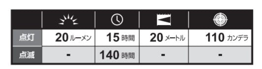●点灯時間(約): 15時間(点灯)/ 140時間(点滅)