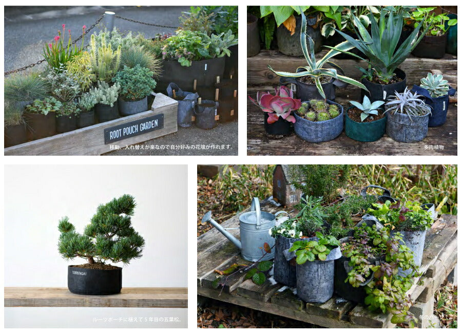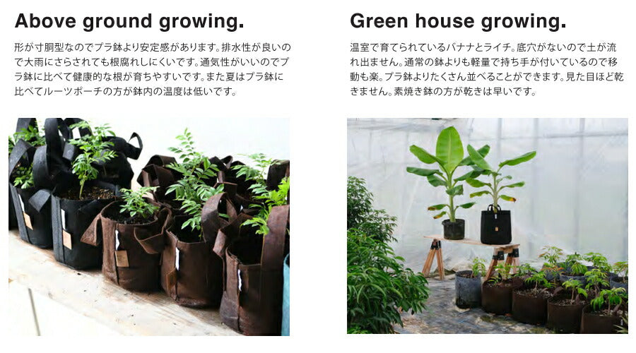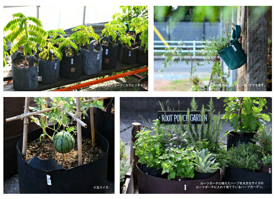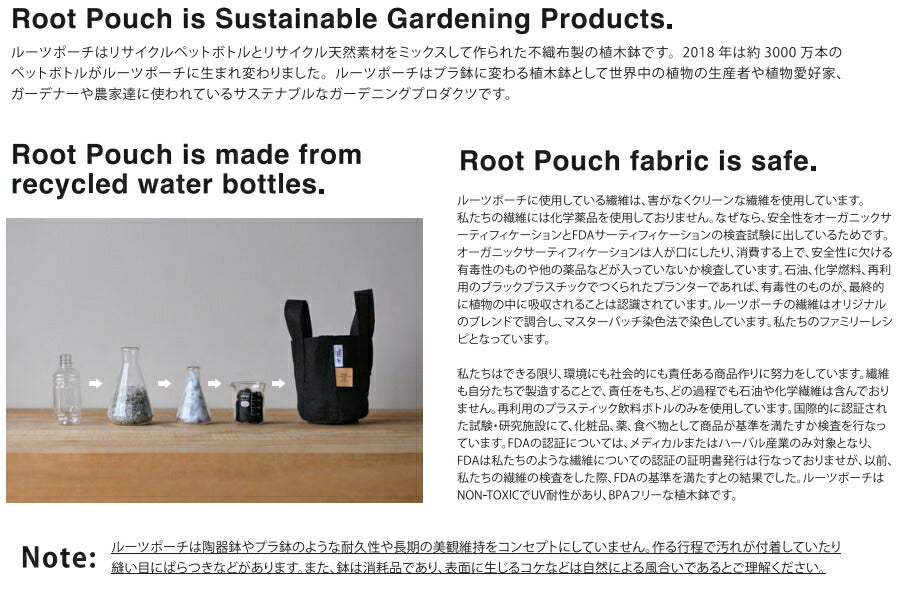 ●ルーツポーチはリサイクルペットボトルとリサイクル天然素材をミックスして作った不織布製の植木鉢です。通気性や透水性がよく植物の最も大切な根の育ちが良いと高く評価され、国内外の植物の生産者やガーデナー達が樹木や草花、野菜などの栽培に使っています。軽量なので移動が楽でバルコニーガーデンやルーフトップガーデンにも最適。ルーツポーチは植物と地球に優しいこれからのサステナブルなガーデニングプロダクツです。是非ご活用ください。