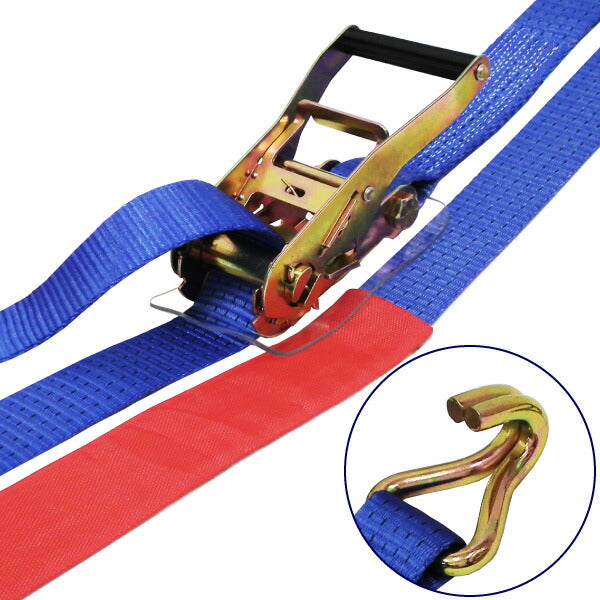 ●ラチェットバックル式カギフックのラッシングベルト、握り易いバックルと柔軟強度な繊維ベルトで荷に優しく簡単安全に荷締め作業ができます。