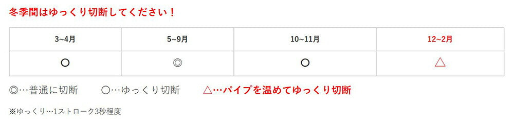 ※冬期間または気温が低い時は、パイプが割れやすいので、ゆっくり切断するか切断部を温めてから切断してください。
