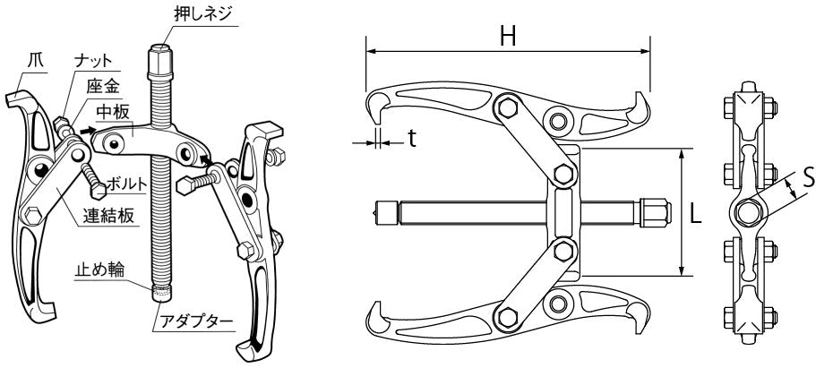 ●ギヤ・ベアリング・プーリーなどの引き抜き作業に爪の連結穴を2つにし、穴を変えることで幅の広いギヤや深いところのギヤもくわえられます(GP-75は1つ穴タイプです)。