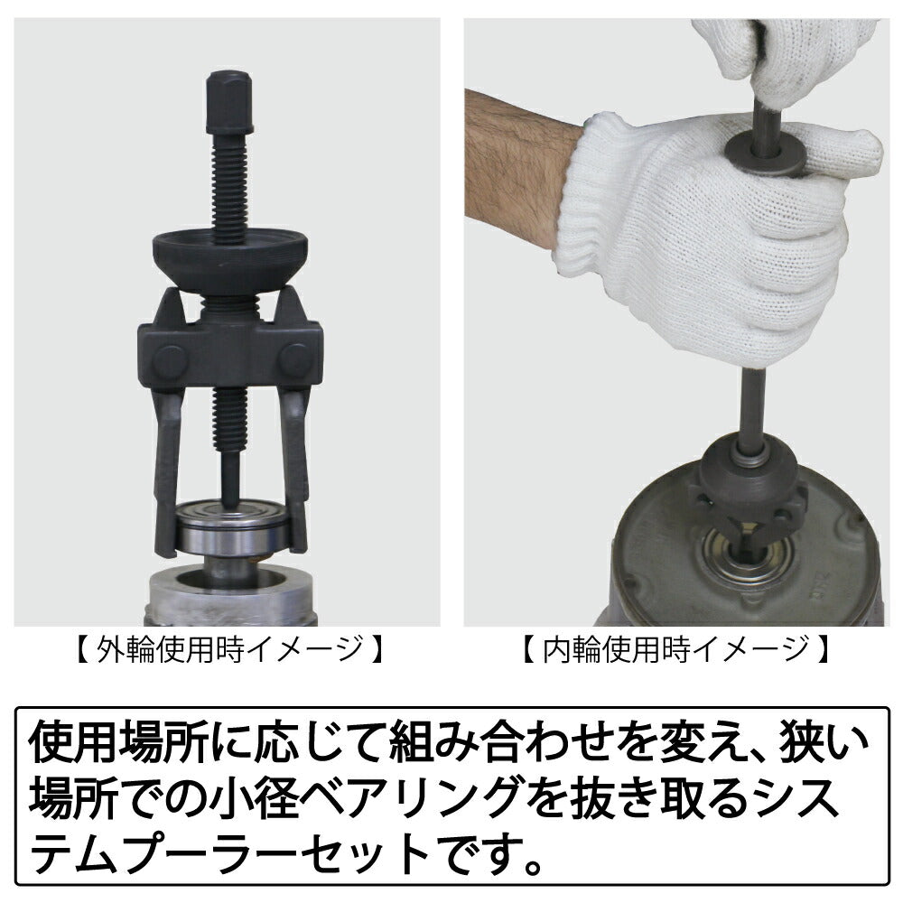 ●使用場所に応じて組み合わせを変え、小径ベアリングを抜き取るシステムプーラーセットです。