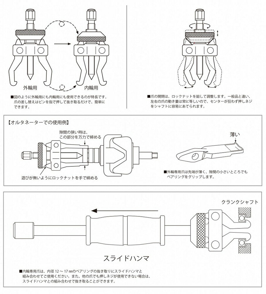 ※爪先端を確実にベアリングに掛け、ロックナットを遊びがなくなるまで、しっかりと締めてください。