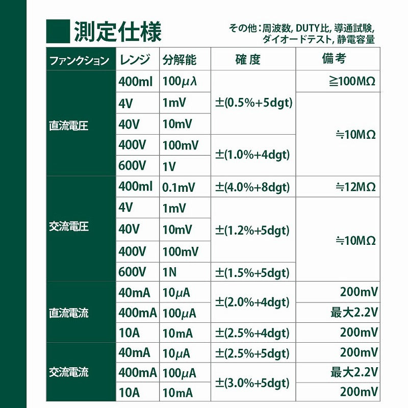 ●付属品: テストリード&ホルスター、単三形乾電池2本(テスト用内蔵)、スペア電池2本(テスト用)、スペアヒューズ0.5A/250V、10A/250V各1本、取扱説明書
