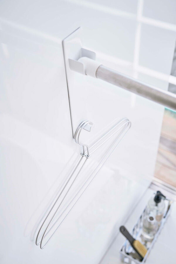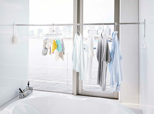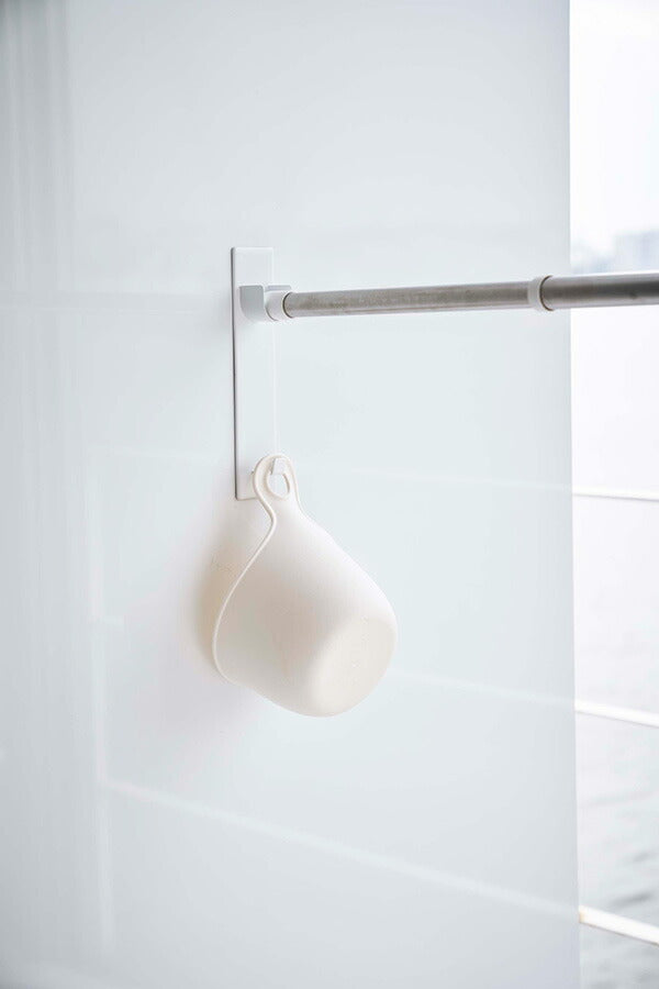 ●浴室の好な位置に簡単取り付けできる便利なフック付きの物干し竿ホルダー。