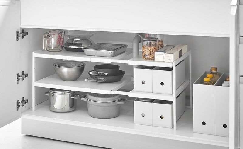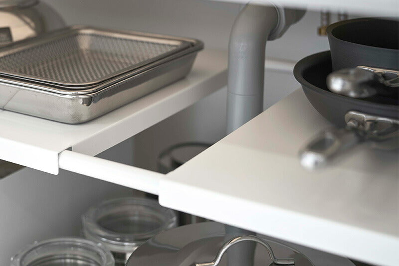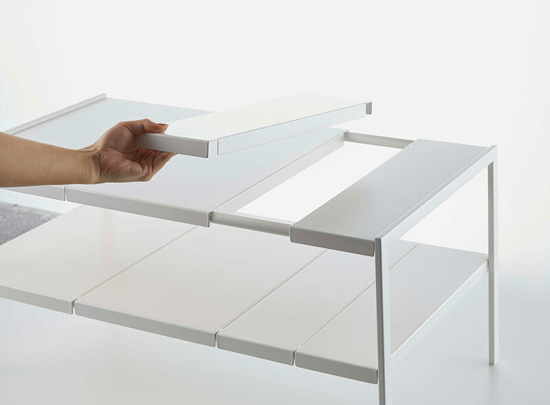 ●伸縮できるから設置場所の幅に合わせて調整できる丈夫なスチール製伸縮棚!