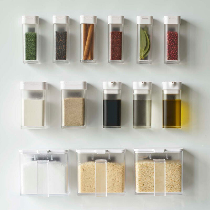 ●マグネットが付く冷蔵庫やパネルに簡単取り付けの調味料容器シリーズ。