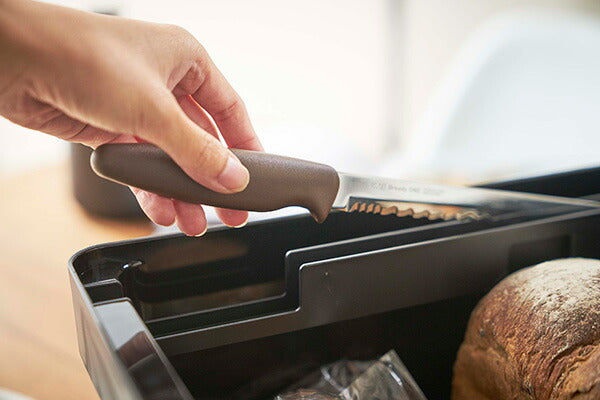 ●蓋がカッティングボードとして使えるパン切り包丁ホルダー付きのスタイリッシュなブレッドケース。