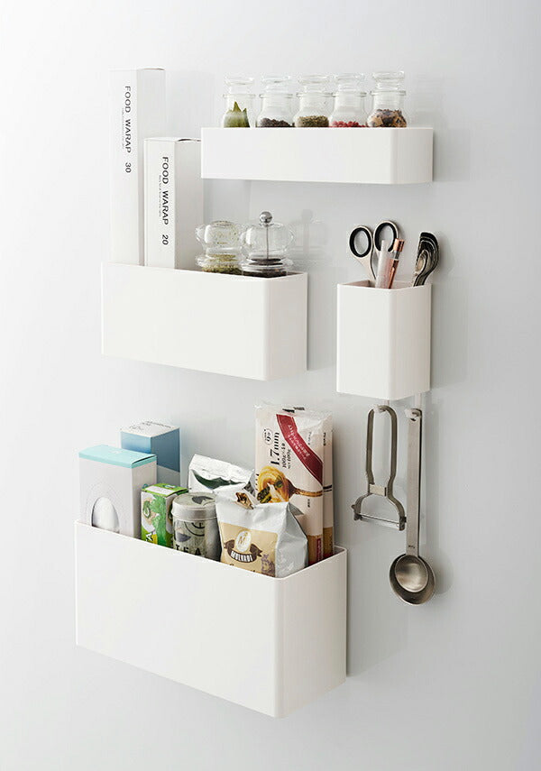 ●マグネットが付く冷蔵庫やパネルに簡単取り付けの収納ケースシリーズ。