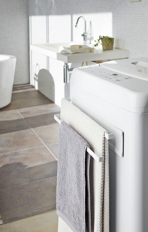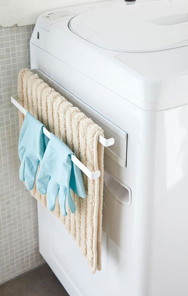 ●干す場所に困るバスタオルやバスマットなどを洗濯機横に強力磁石でスリムに収納。