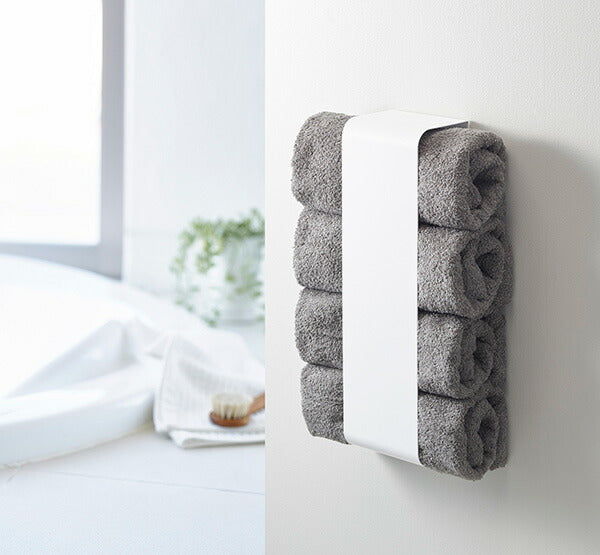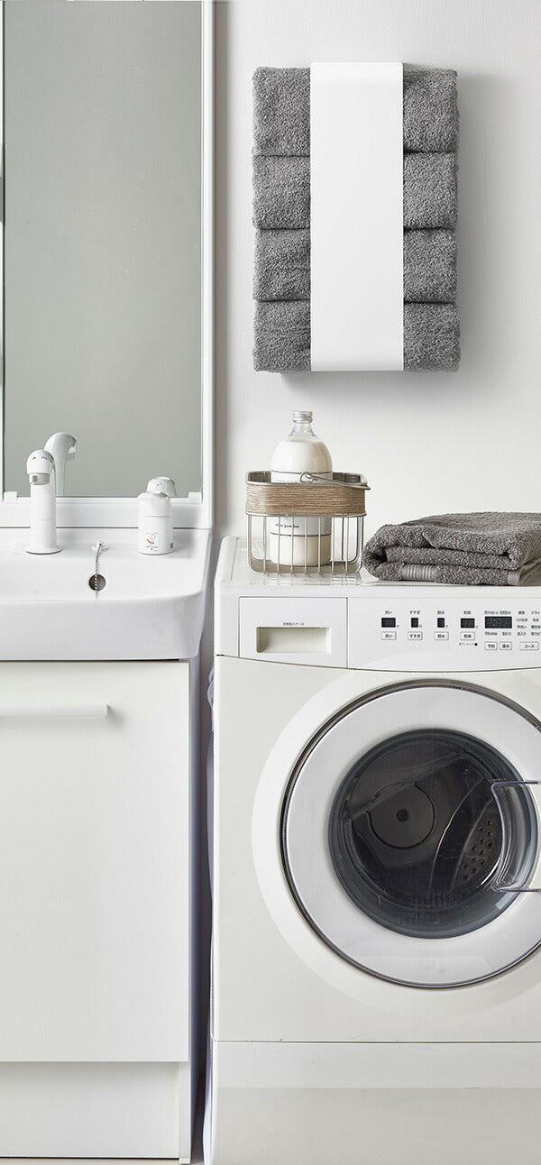 ●バスタオルを丸めて洗濯機や壁面にすっきり収納。
