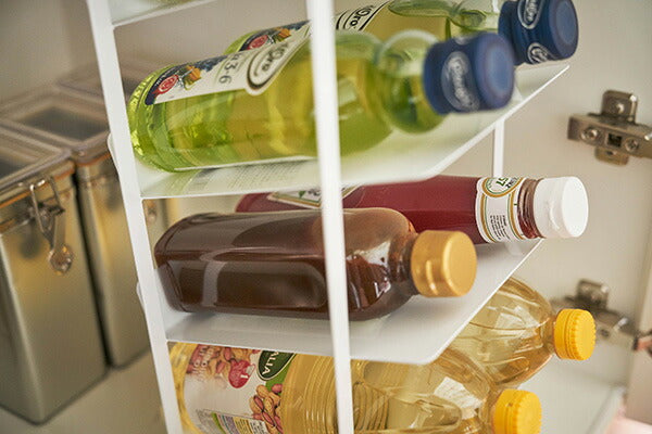 ●調味料ボトルやペットボトル、シャンプーボトル、洗剤ボトル、スプレー缶まで幅広く収納可能な4段ストッカー。