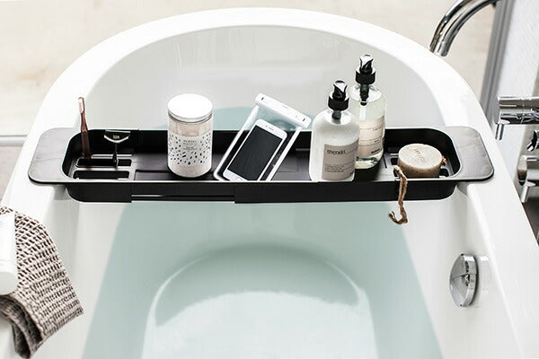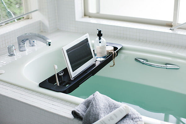 ●伸縮式で浴槽の縁にぴったりフィットのバスタブトレー。