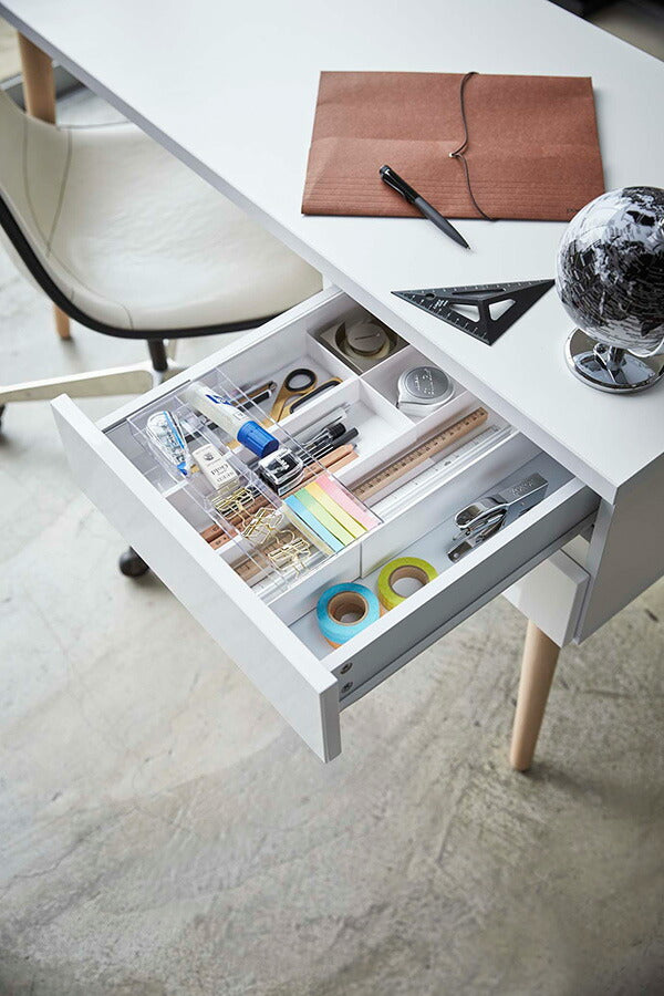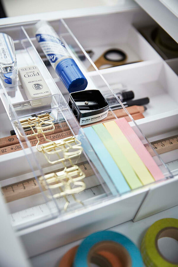 ●スライド式の上段トレーには消しゴムやクリップ、スティックのりなどの小物を分けて収納できます。