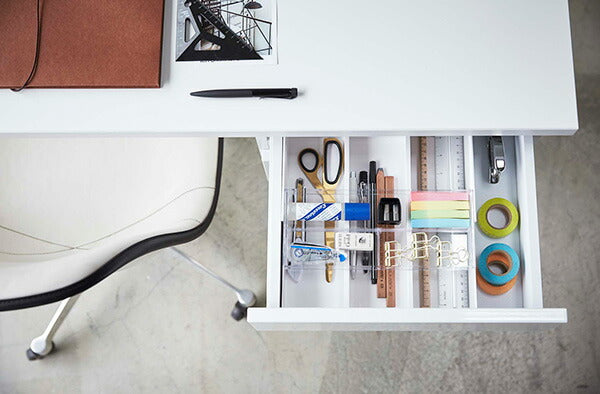 ●伸縮式の下段トレーにはペンやはさみだけではなく、定規などの長いステーショナリーも収納できます。