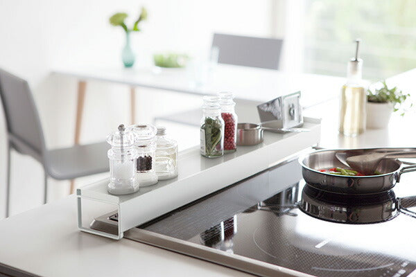 ●スパイスや調味料などが置けるガード付きの棚で排気口上を有効活用!