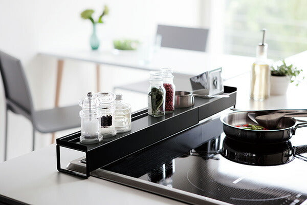 ●スパイスや調味料などが置けるガード付きの棚で排気口上を有効活用!