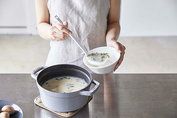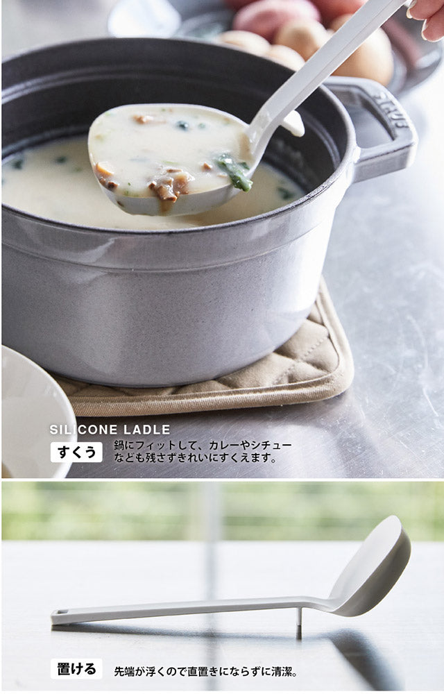 ●また、先端が浮くので直置きにならず清潔。 鍋にフィットして、カレーやシチューなども残さずきれいにすくえます。