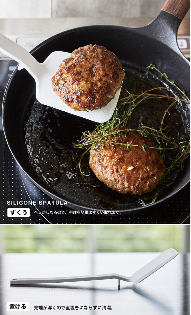 ●また、先端が浮くので直置きにならず清潔。 ●ヘラがしなるので、料理を簡単にすくい取れます。