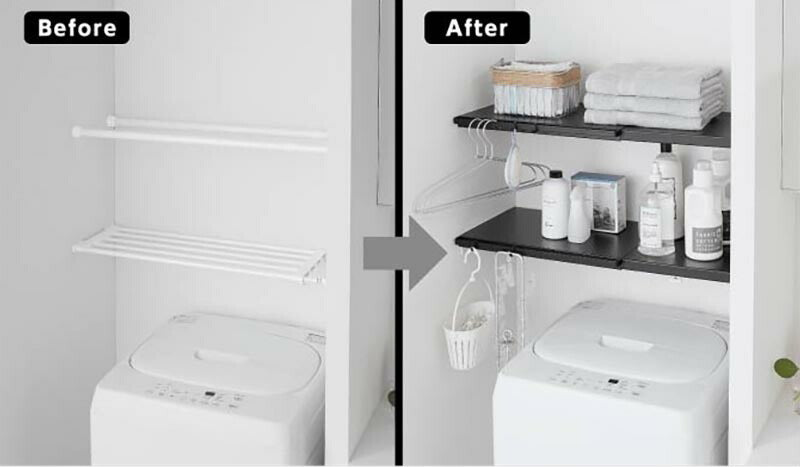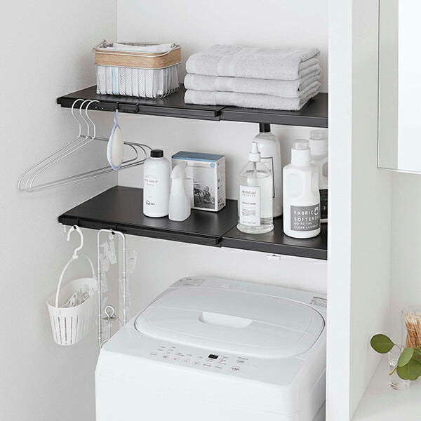 ●つっぱり棒に乗せるだけで棚が完成!伸縮式なので使いたい幅に合わせて設置できます。
