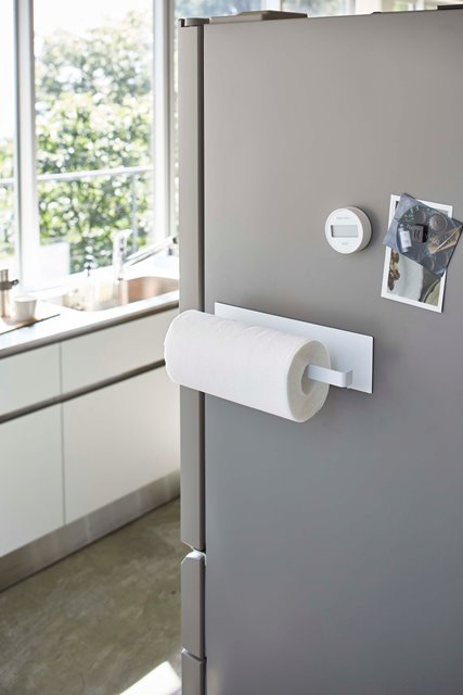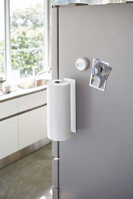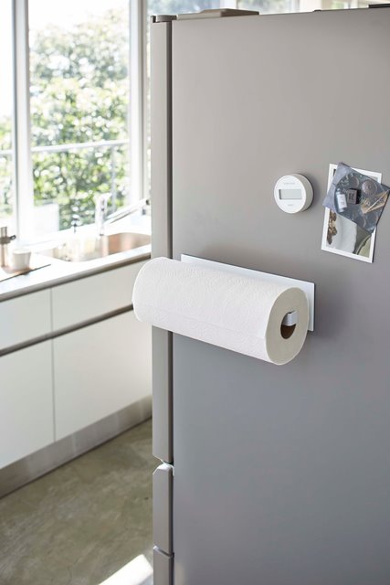 ●マグネットが付くスチール壁面に簡単取り付けのキッチンペーパーホルダー。