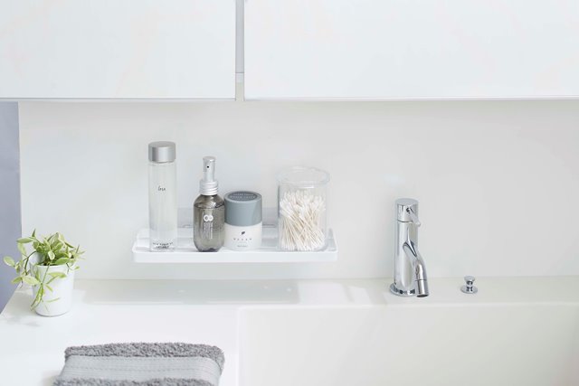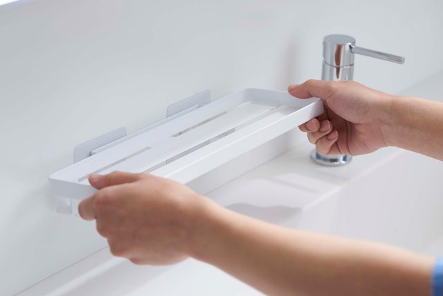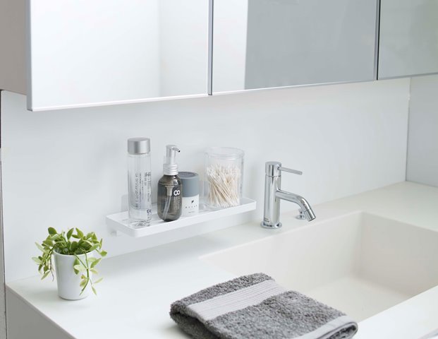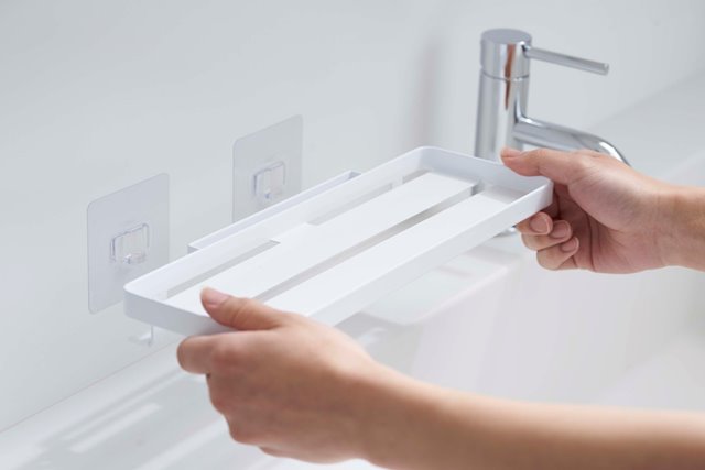 ●貼って剥がせるフィルムフックで好きな位置に設置できるワイドなサニタリーラック。
