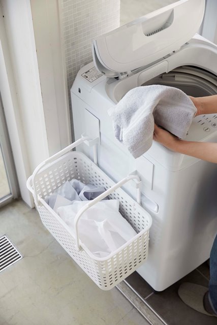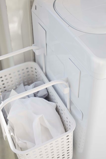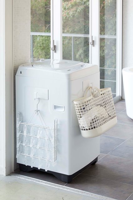 ●2個同時に使用すれば、ランドリーバスケットのハンドルを引っ掛けて、浮かせてスッキリ整頓!