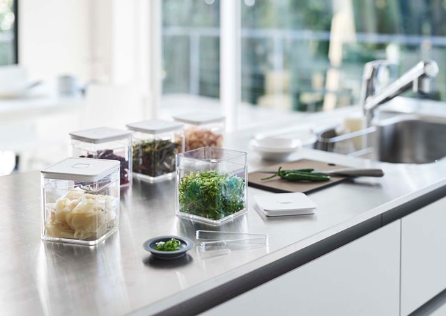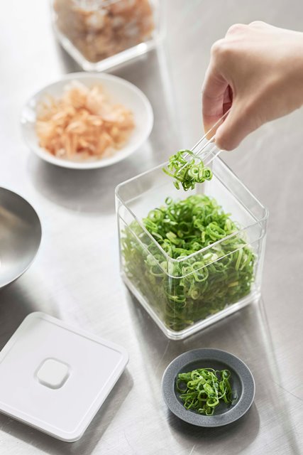 ●バルブで密閉できるトング付き保存容器。