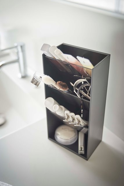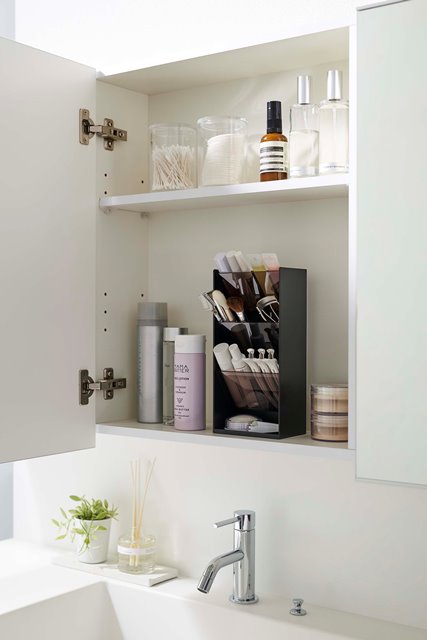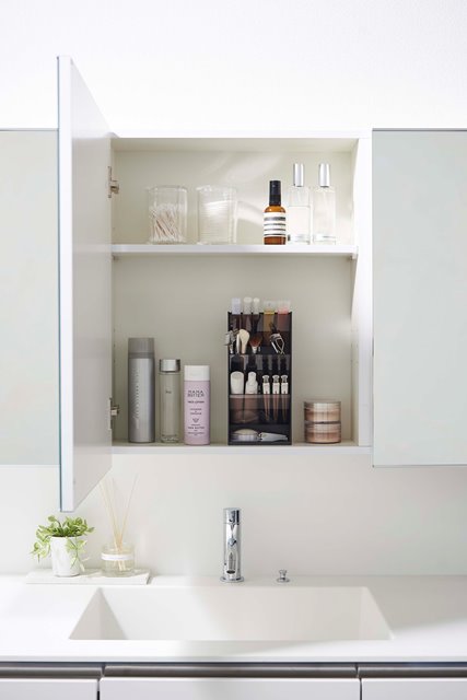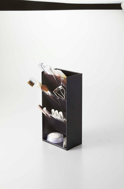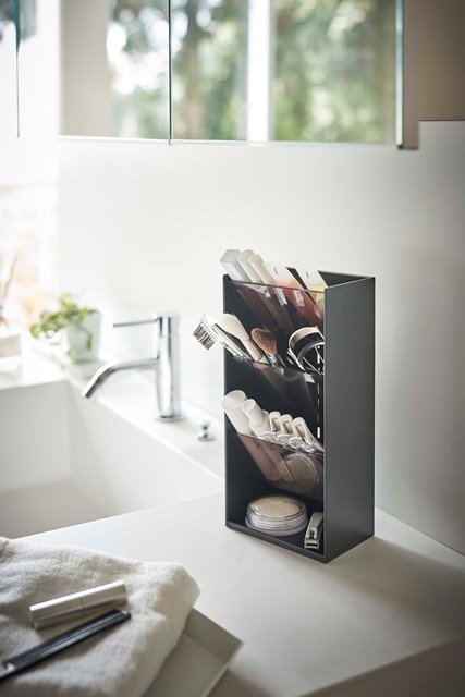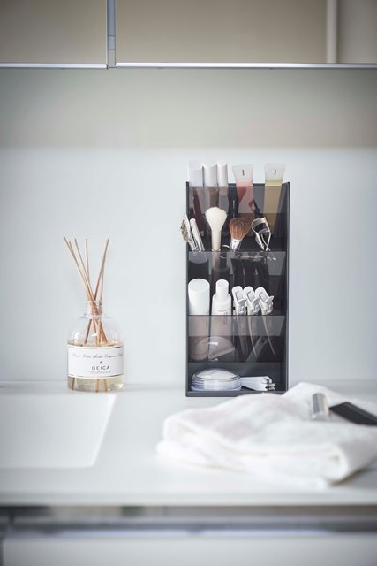 ●メイクブラシ・リップ・アイライナーなどを取り出しやすいように斜めに収納できるコスメ立体収納ケース。