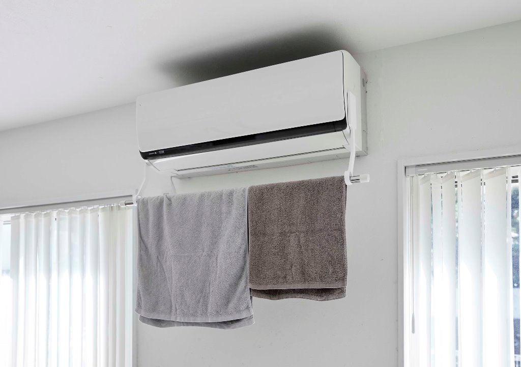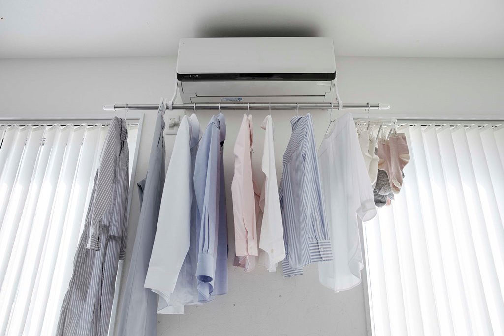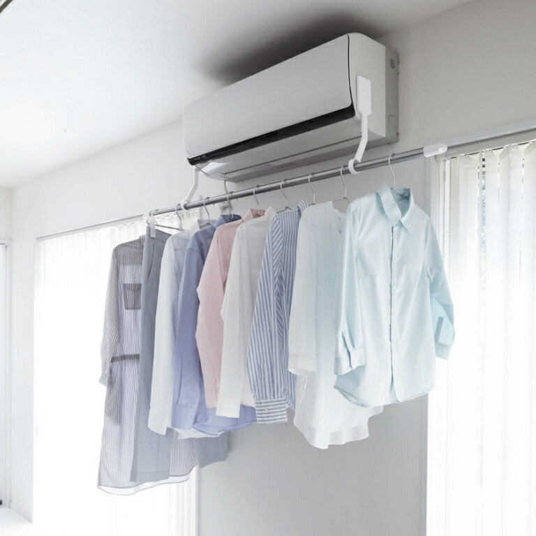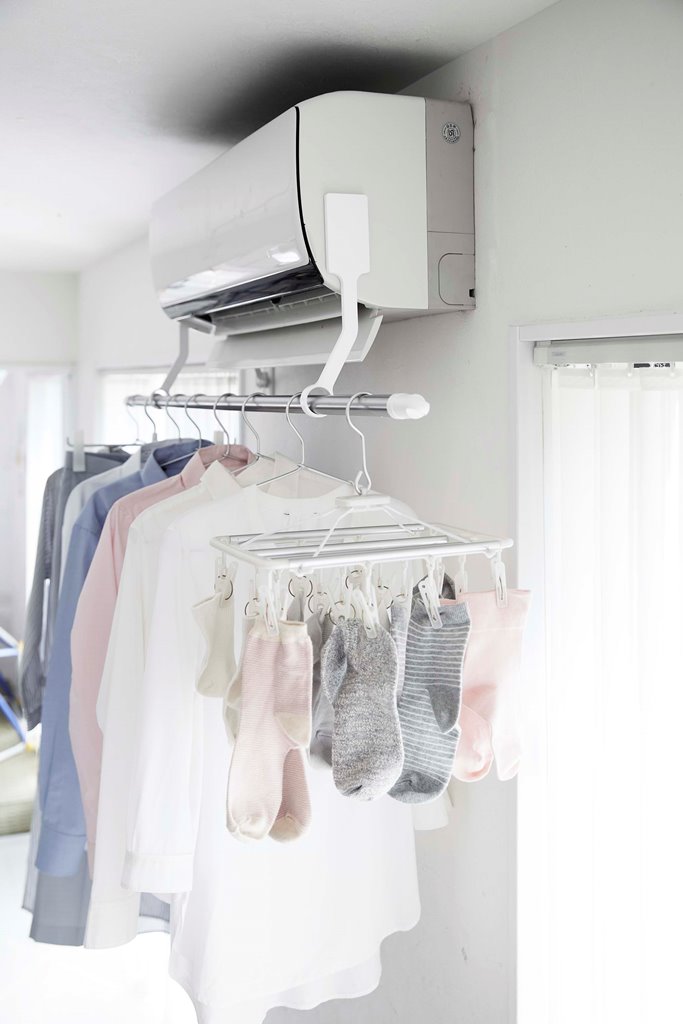 ●エアコンの風を直接当てて、洗濯物を効率よく乾かすことができる室内物干しポールホルダー。